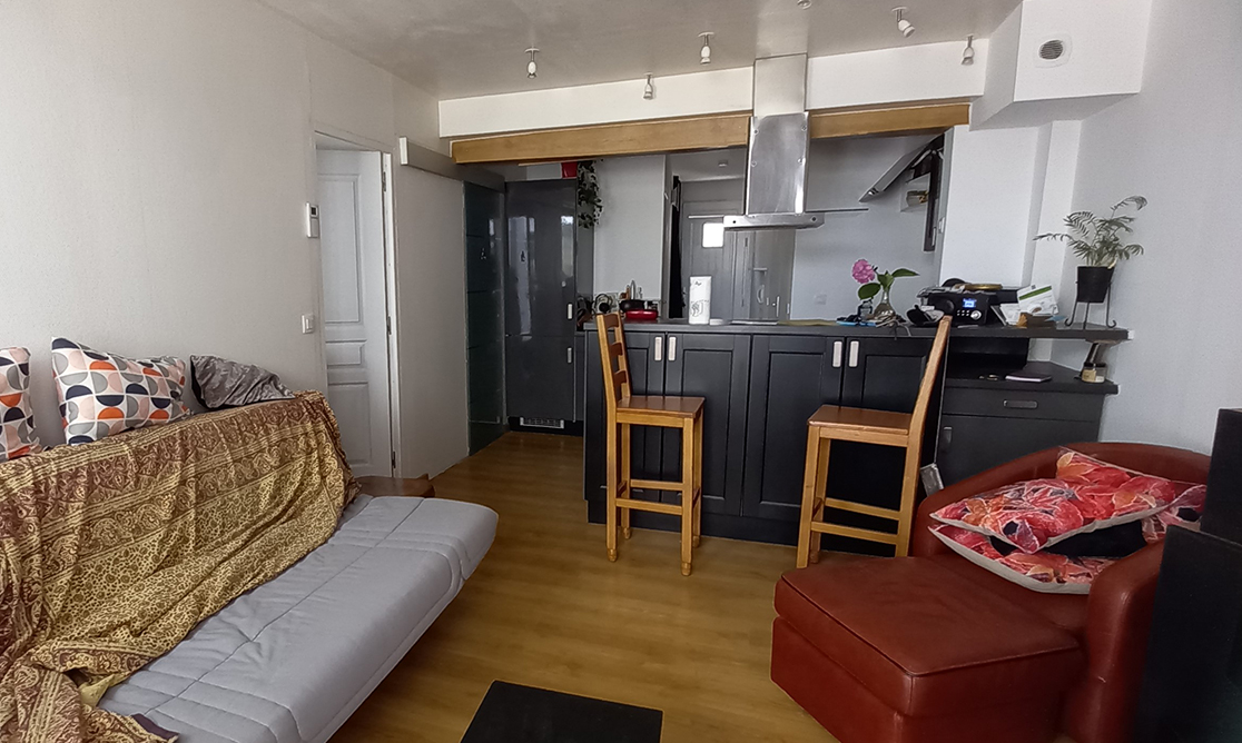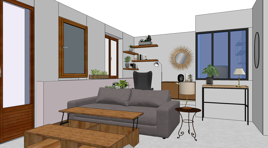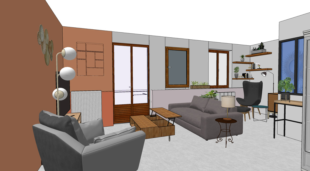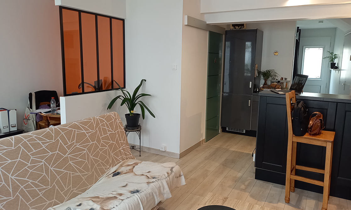 Afin d’agrandir le salon, la cliente souhaitait supprimer la cloison qui sépare ce salon et une chambre adjacente. Et aussi créer un espace bureau pour faire du télétravail grâce à un muret monté d’une verrière 4 vitrages. Elle souhaitait aussi changer le revêtement du sol (parquet stratifié bois clair ou gris/blanc cérusé); Puis réagencer et décorer cet espace afin d’avoir un lieu chaleureux, agréable à vivre et à recevoir.