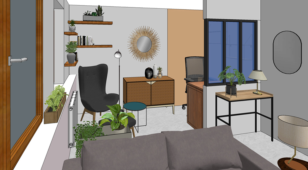 Proposition d’aménagement et décoration de l’angle opposé à l’espace bureau :