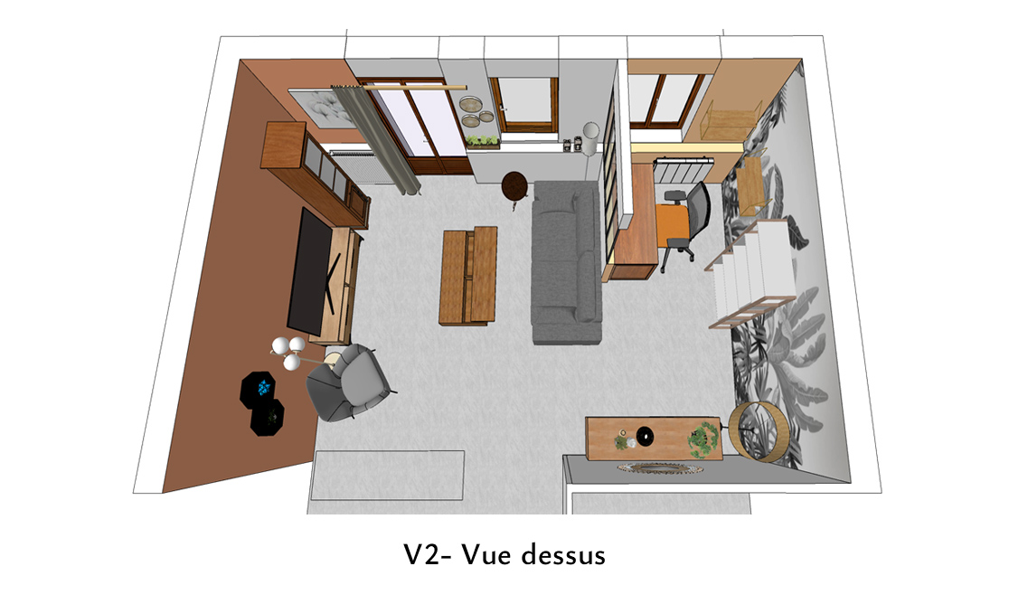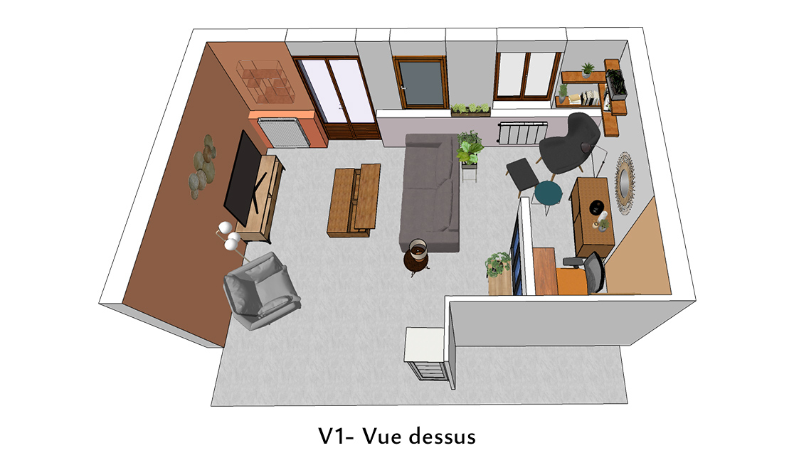 Grâce à la vue 3D du plan vue dessus, le client peut avoir une vue d’ensemble sur les différents aménagements et décorations que l’on propose. Ainsi il peut se projeter plus facilement sur la finalité de son projet.