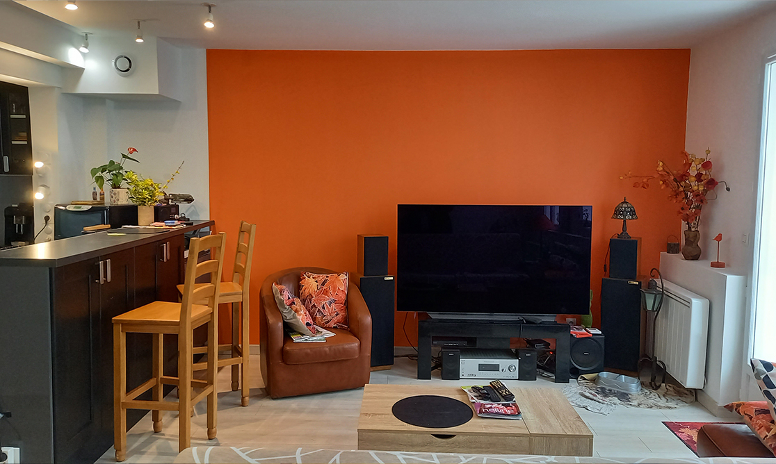 Après suggestion, ma cliente a été séduite par l’idée d’avoir un ou plusieurs murs de couleurs dans cette pièce afin d’apporter une ambiance chaleureuse, et lumineuse. Cela donne aussi un certain caractère à la pièce. Le choix de peindre ce mur qui se prolonge vers l’espace cuisine a été fait dans le but d’attirer le regard lorsqu’on arrive dans cette pièce, et met aussi en valeur les meubles en bois clair de la pièce. Elle crée aussi un contraste avec le gris anthracite de la cuisine. Le choix de la couleur s’est fait selon les goûts de la cliente, des tons chauds vifs et profonds, en y ajoutant une touche de vert avec des plantes. Les meubles en bois clairs ont été privilégié afin d’éclaircir cette pièce.